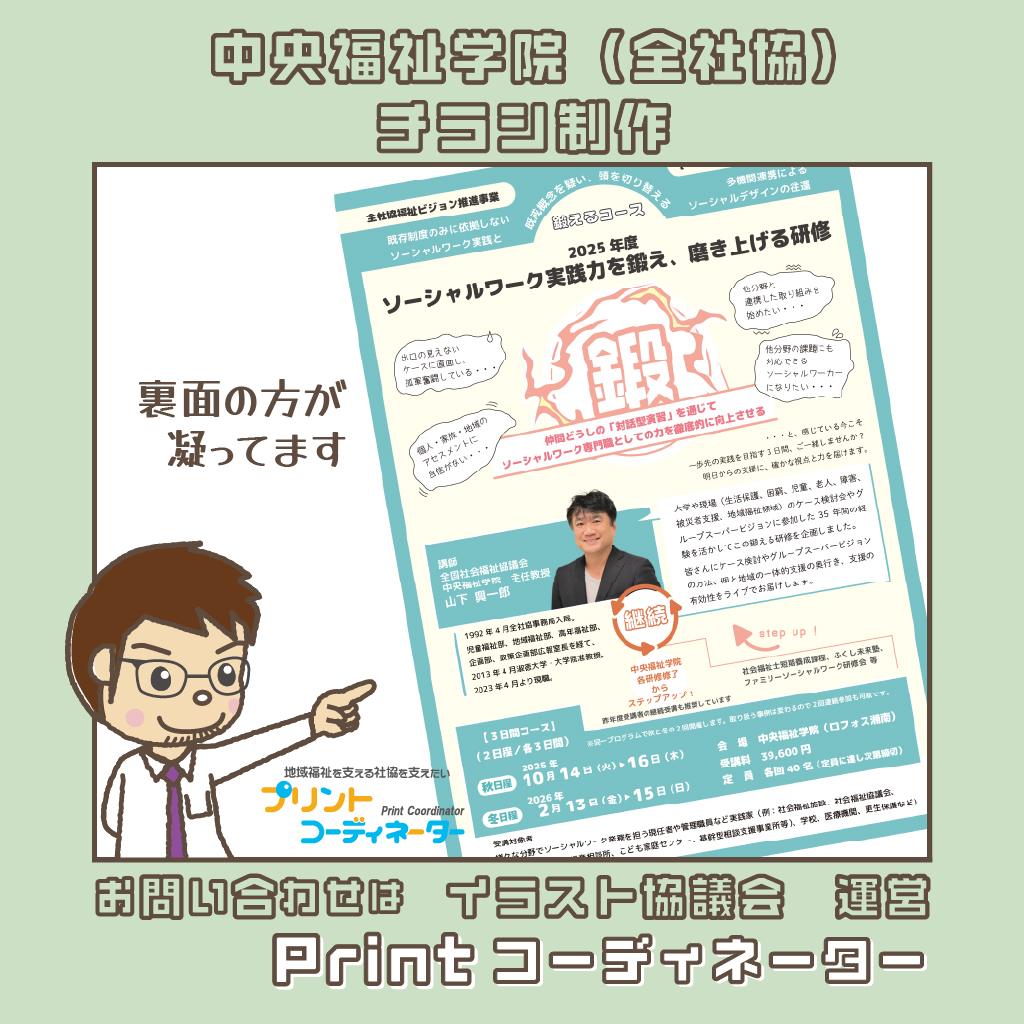 中央福祉学院(全国社会福祉協議会)様より、チラシ制作のご依頼をいただきました。「ソーシャルワーク実践力を鍛え、磨き上げる研修」チラシを制作させていただきました。