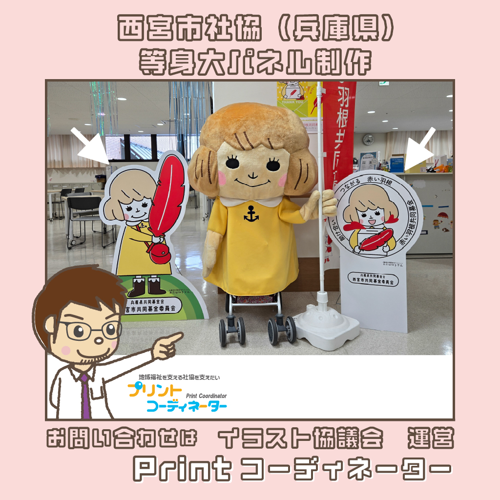 西宮市社会福祉協議会(兵庫県)様より、兵庫県共同募金会マスコット「あかはねちゃん」の等身大パネル制作のご依頼をいただきました。